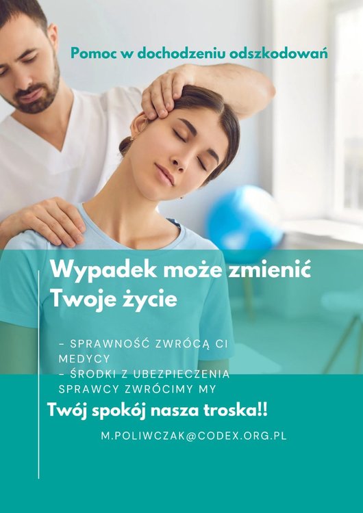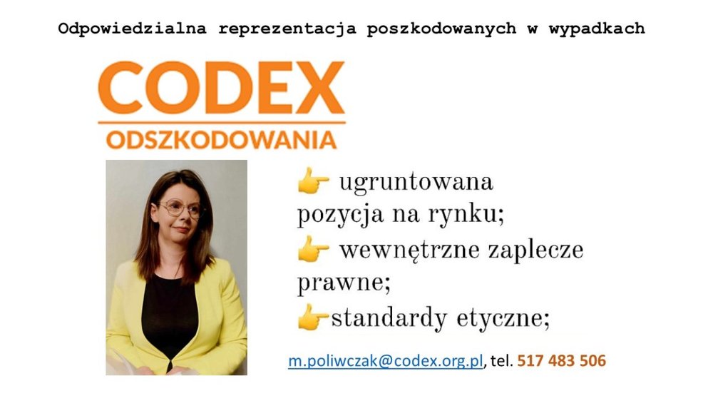 Gdy po wypadku zaczynasz dochodzić należnego odszkodowania z OC sprawcy, ale: Potrzebujesz porady prawnej, a nie masz wolnych środków finansowych Nie masz siły walczyć z ubezpieczycielem Jesteś przerażony/a i nie wiesz jak poruszać się w gąszczu procedur narzuconych przez ubezpieczyciela ubezpieczyciel próbuje odprawić Cię z kwitkiem; proponują Ci marne grosze za Twoją krzywdę, stracone zdrowie lub cierpienie po stracie najbliższych w wyniku wypadku; Co robić? zapytaj profesjonalisty w branży odszkodowawczej, to nic nie kosztuje! Twój spokój, nasza troska! Po wypadku bez wpadek! profesjonalny pełnomocnik jest gwarantem godziwego odszkodowania z towarzystwa ubezpieczeniowego, w którym sprawca wykupił polisę OC, Kancelaria Codex także posiada OC, które chroni naszych klientów w każdym wypadku! m.poliwczak@codex.org.pl, SMS lub telefon 517483506 www.codex.org.pl, FB Poliwczak Magda Odszkodowania-